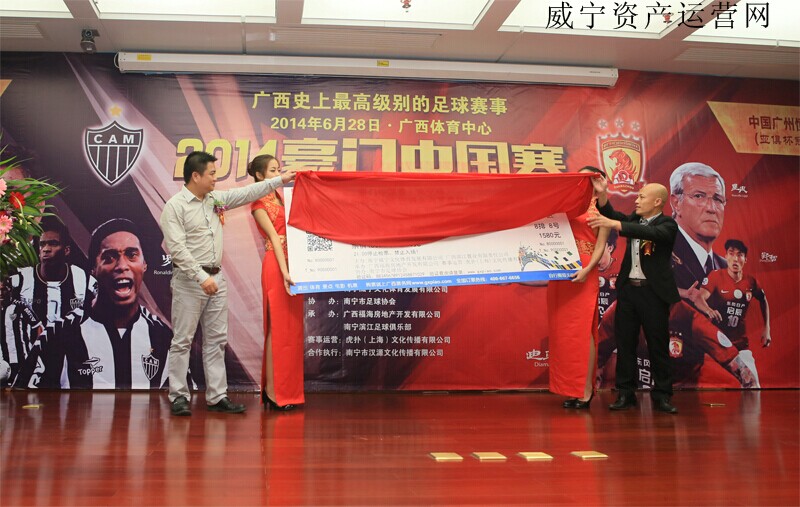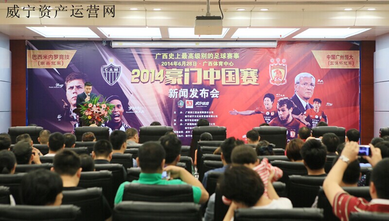 4月18日上午,2014豪门中国赛南宁站新闻发布会在广西体育中心新闻发布厅举行。会上透露,6月28日晚,亚冠冠军广州恒大将坐镇广西体育中心主体育场挑战由前世界足球先生罗纳尔迪尼奥率领的南美冠军米内罗竞技。
