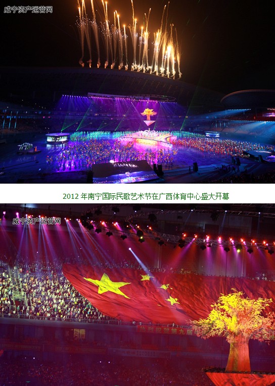 9月21日晚,第九届中国-东盟博览会开幕晚会暨第十四届南宁国际民歌艺术节在广西体育中心隆重开幕。到2012年,“大地飞歌-南宁国际民歌艺术节”已经走过十四个春秋,今年的民歌节开幕晚会更是其举办以来最为盛大的一届,其舞台和观众都是以往的两倍, 360度全景式舞台和3D的视觉效果,让到场的4万2千名观众享受到了一场美轮美奂的艺术盛宴。